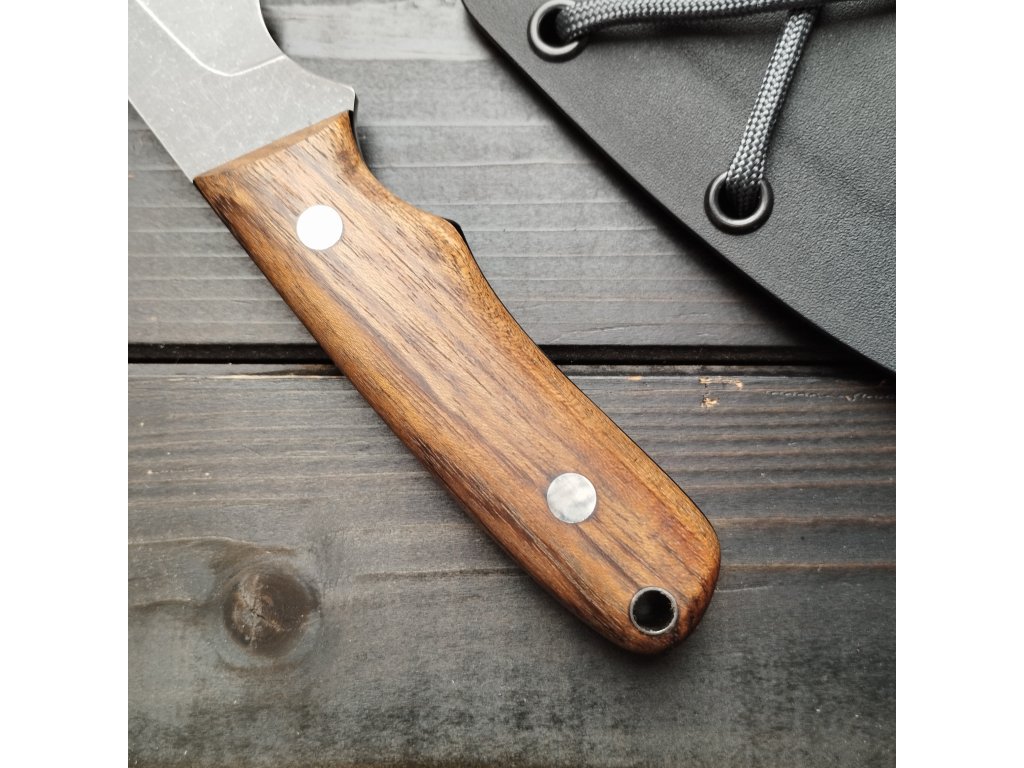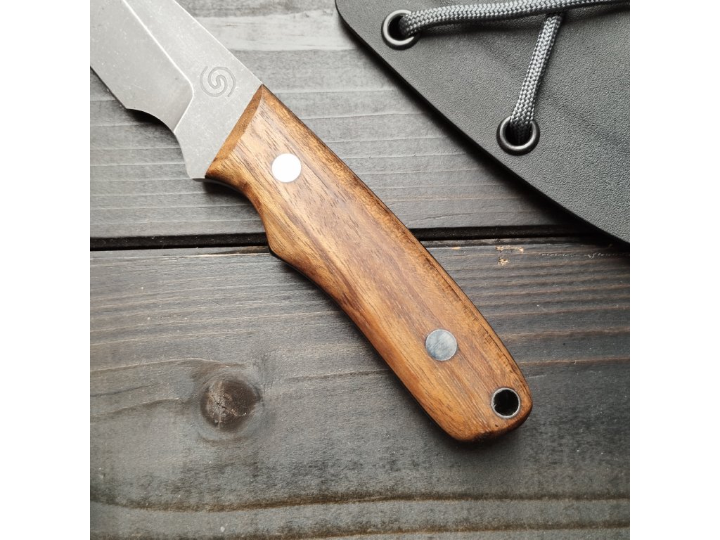 🌿 Ergonomická rukojeť z exotického dřeva avangol. Je zpevněna corby nýty pro maximální pevnost a ošetřena tungovým olejem a karnaubským voskem pro vyšší životnost a odolnost vůči vlhkosti.