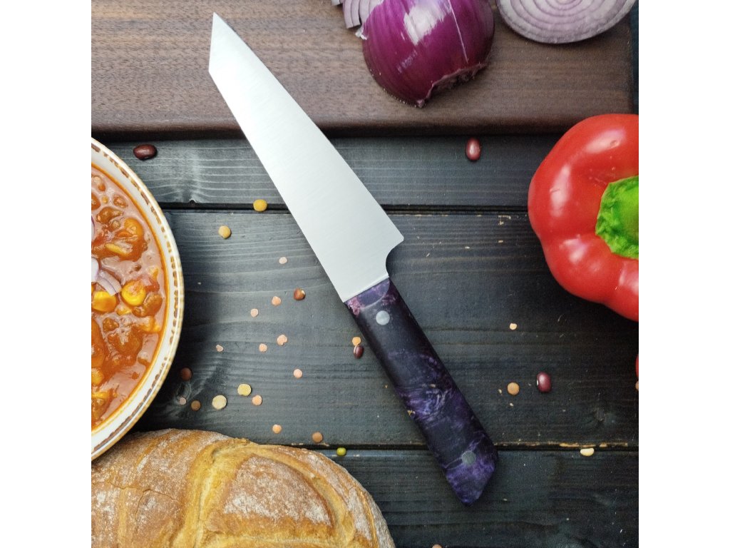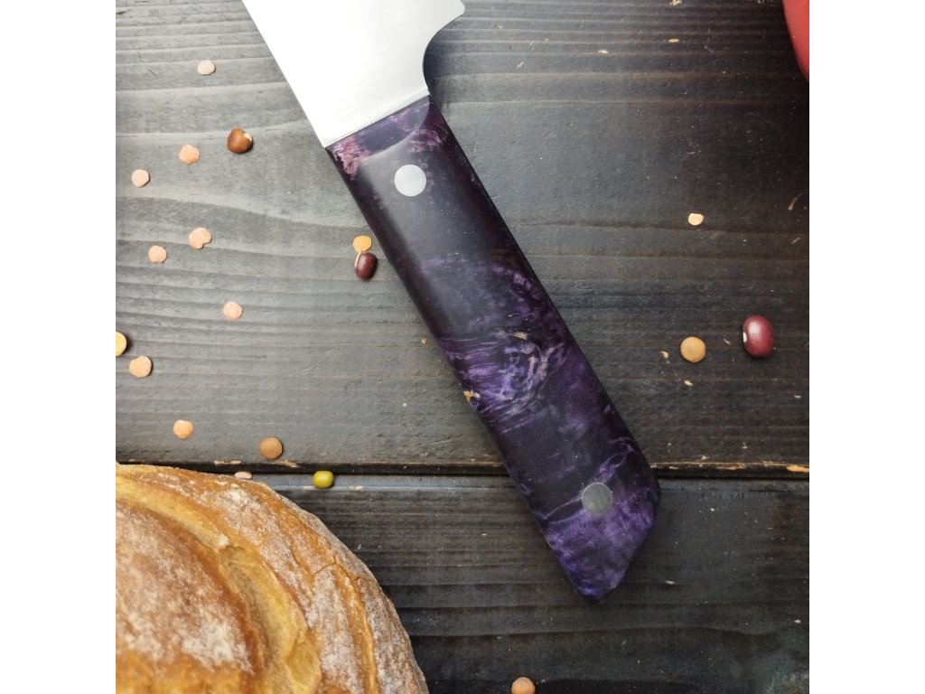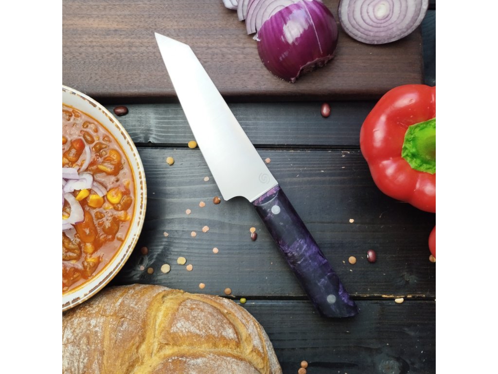 Tento ručně vyráběný nůž s čepelí dlouhou 14 cm je ideální pro každodenní práci v kuchyni – snadno nakrájíte zeleninu, maso i bylinky. Oproti velkým kuchařským nožům má kratší čepel a lehce zmenšenou rukojeť, což usnadňuje manipulaci a zvyšuje přesnost krájení.