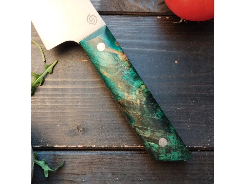 Díky vysoce kvalitní nerezové oceli je nůž odolný vůči vlhkosti a méně náročný na údržbu. Stabilizované dřevo je zpevněné epoxidovou pryskyřicí, což zvyšuje jeho tvrdost, snižuje nasákavost a brání praskání. Každá rukojeť je navíc ošetřena tungovým olejem a karnaubským voskem pro dlouhou životnost a luxusní vzhled.