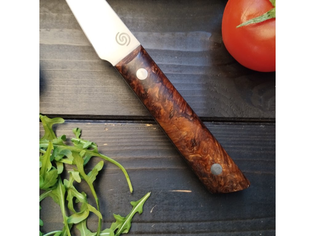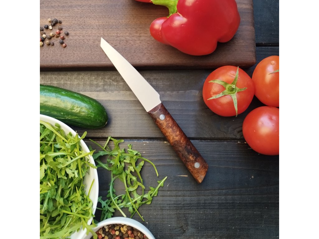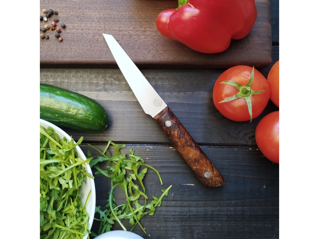 Tento ručně vyráběný kuchyňský nůž je ideální pro precizní práci v kuchyni – skvěle se hodí na krájení zeleniny, bylinek i masa. Díky kratší 9 cm čepeli a ergonomické rukojeti je snadno ovladatelný a vhodný pro detailní kuchařské úkony. Oproti velkým kuchařským nožům je lehčí a obratnější.