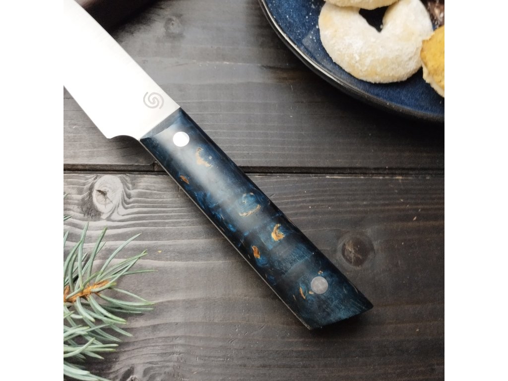 Tento ručně vyráběný kuchyňský nůž je ideální pro precizní práci v kuchyni – skvěle se hodí na krájení zeleniny, bylinek i masa. Díky kratší 11cm čepeli a ergonomické rukojeti je snadno ovladatelný a vhodný pro detailní kuchařské úkony. Oproti velkým kuchařským nožům je lehčí, obratnější a umožňuje pohodlné houpavé krájení.