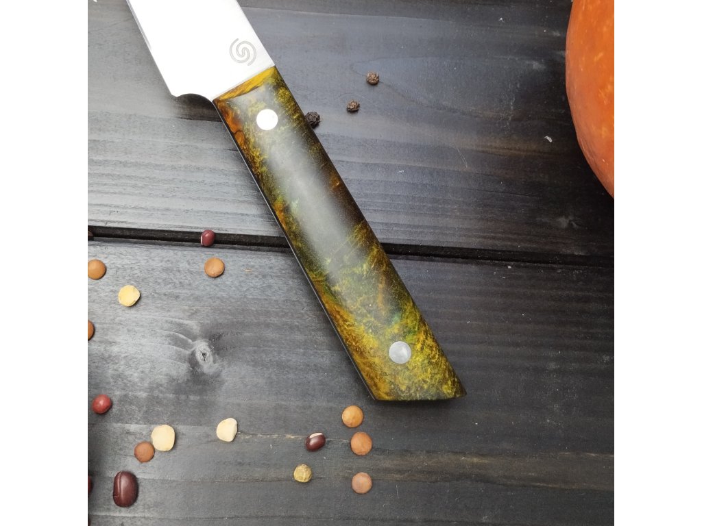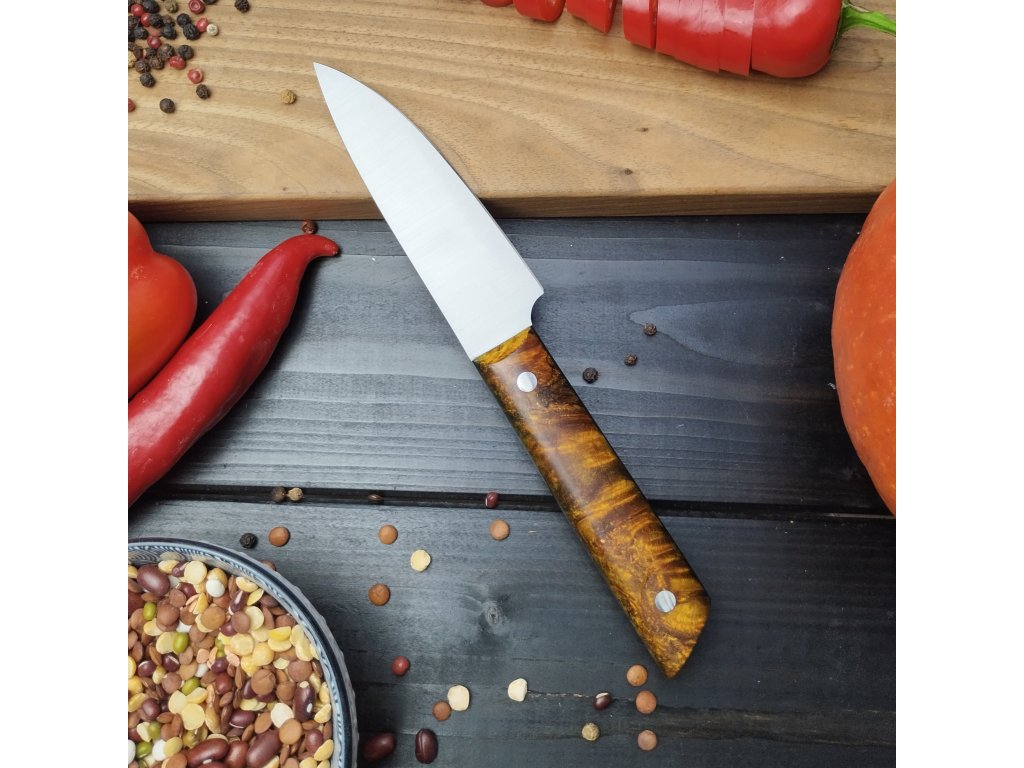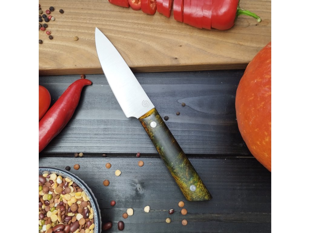 Tento ručně vyráběný kuchyňský nůž je ideální pro precizní práci v kuchyni – skvěle se hodí na krájení zeleniny, bylinek i masa. Díky kratší 11cm čepeli a ergonomické rukojeti je snadno ovladatelný a vhodný pro detailní kuchařské úkony. Oproti velkým kuchařským nožům je lehčí, obratnější a umožňuje pohodlné houpavé krájení.