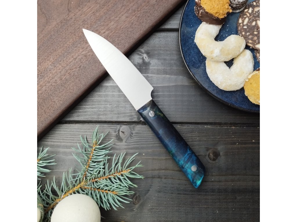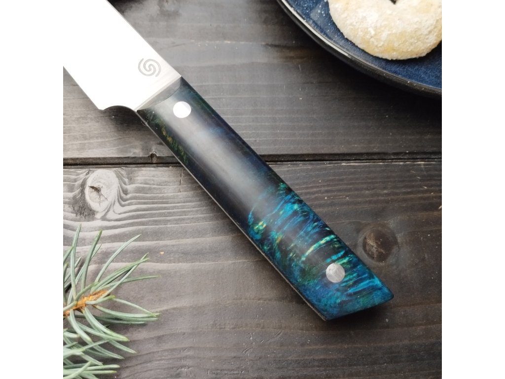 Tento ručně vyráběný kuchyňský nůž je ideální pro precizní práci v kuchyni – skvěle se hodí na krájení zeleniny, bylinek i masa. Díky kratší 11cm čepeli a ergonomické rukojeti je snadno ovladatelný a vhodný pro detailní kuchařské úkony. Oproti velkým kuchařským nožům je lehčí, obratnější a umožňuje pohodlné houpavé krájení.
