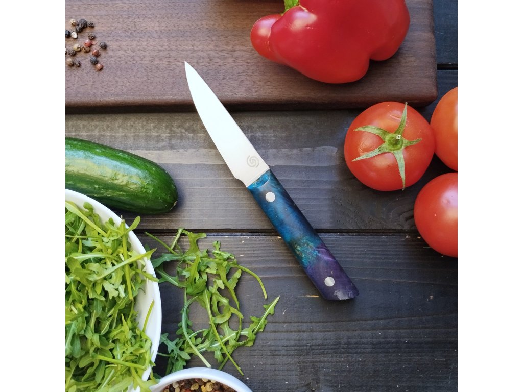 Tento ručně vyráběný kuchyňský nůž je ideální pro precizní práci v kuchyni – skvěle se hodí na krájení zeleniny, bylinek i masa. Díky kratší 9 cm čepeli a ergonomické rukojeti je snadno ovladatelný a vhodný pro detailní kuchařské úkony. Oproti velkým kuchařským nožům je lehčí a obratnější.