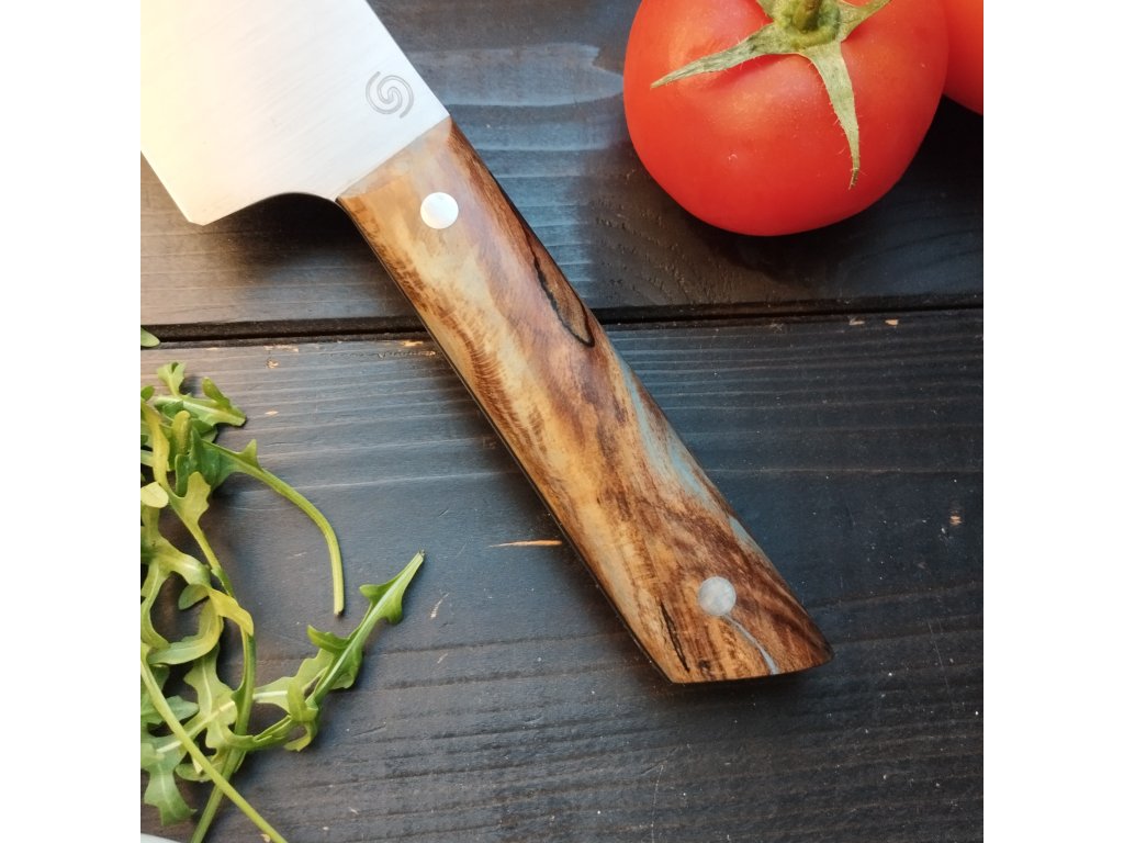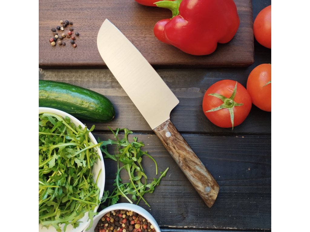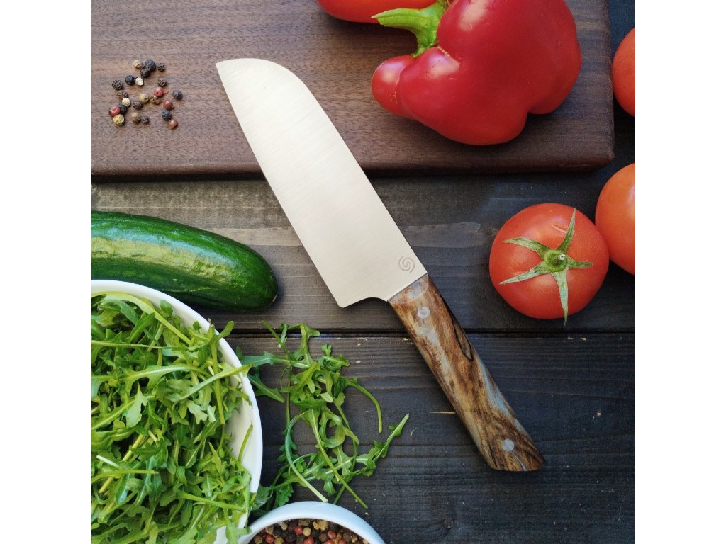 Tento ručně vyráběný Santoku nůž s délkou ostří 14 cm je ideální pro krájení zeleniny, ovoce a masa. Díky vysoké čepeli můžete pohodlně přenášet suroviny z nože rovnou do mísy nebo na pánev. Navíc se skvěle hodí i na drcení česneku.