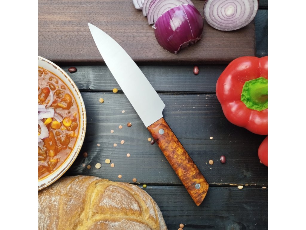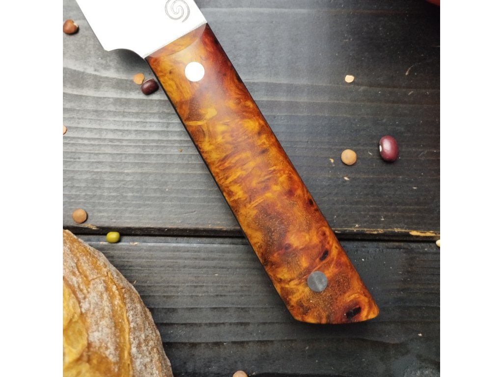 Tento ručně vyráběný nůž s čepelí dlouhou 14 cm je ideální pro každodenní práci v kuchyni – snadno nakrájíte zeleninu, maso i bylinky. Oproti velkým kuchařským nožům má kratší čepel a lehce zmenšenou rukojeť, což usnadňuje manipulaci a zvyšuje přesnost krájení.