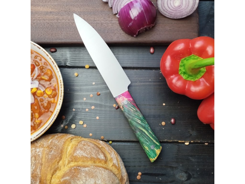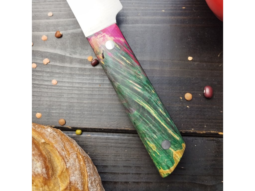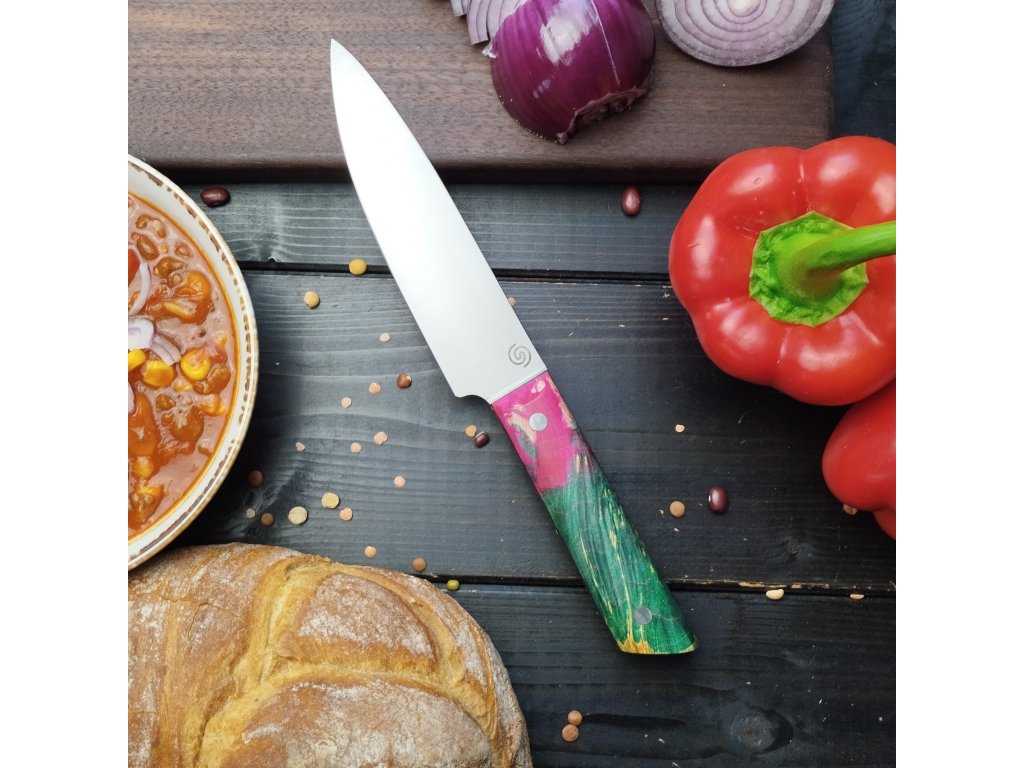 Tento ručně vyráběný nůž s čepelí dlouhou 14 cm je ideální pro každodenní práci v kuchyni – snadno nakrájíte zeleninu, maso i bylinky. Oproti velkým kuchařským nožům má kratší čepel a lehce zmenšenou rukojeť, což usnadňuje manipulaci a zvyšuje přesnost krájení.