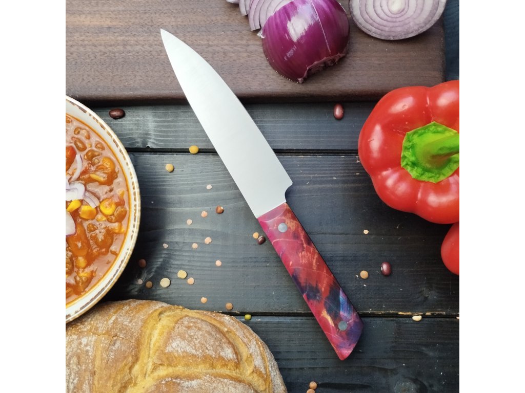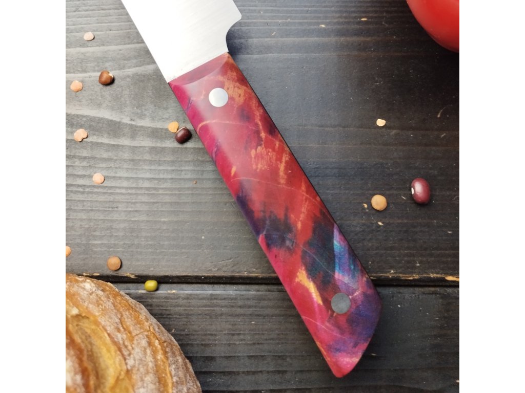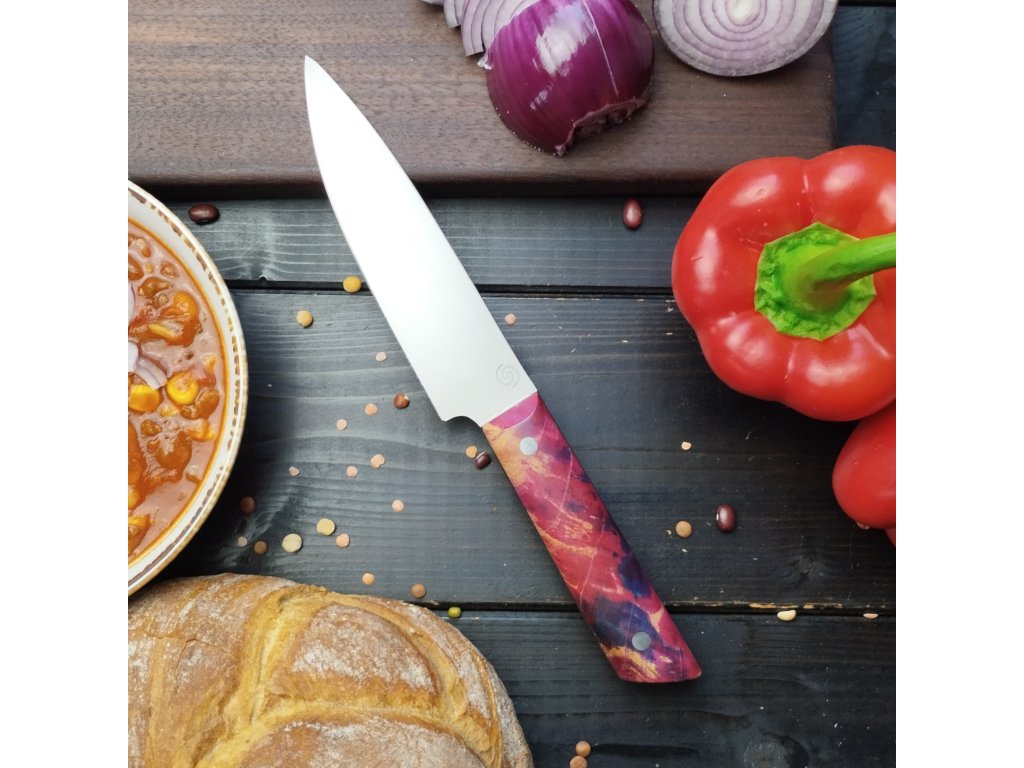 Tento ručně vyráběný nůž s čepelí dlouhou 14 cm je ideální pro každodenní práci v kuchyni – snadno nakrájíte zeleninu, maso i bylinky. Oproti velkým kuchařským nožům má kratší čepel a lehce zmenšenou rukojeť, což usnadňuje manipulaci a zvyšuje přesnost krájení.
