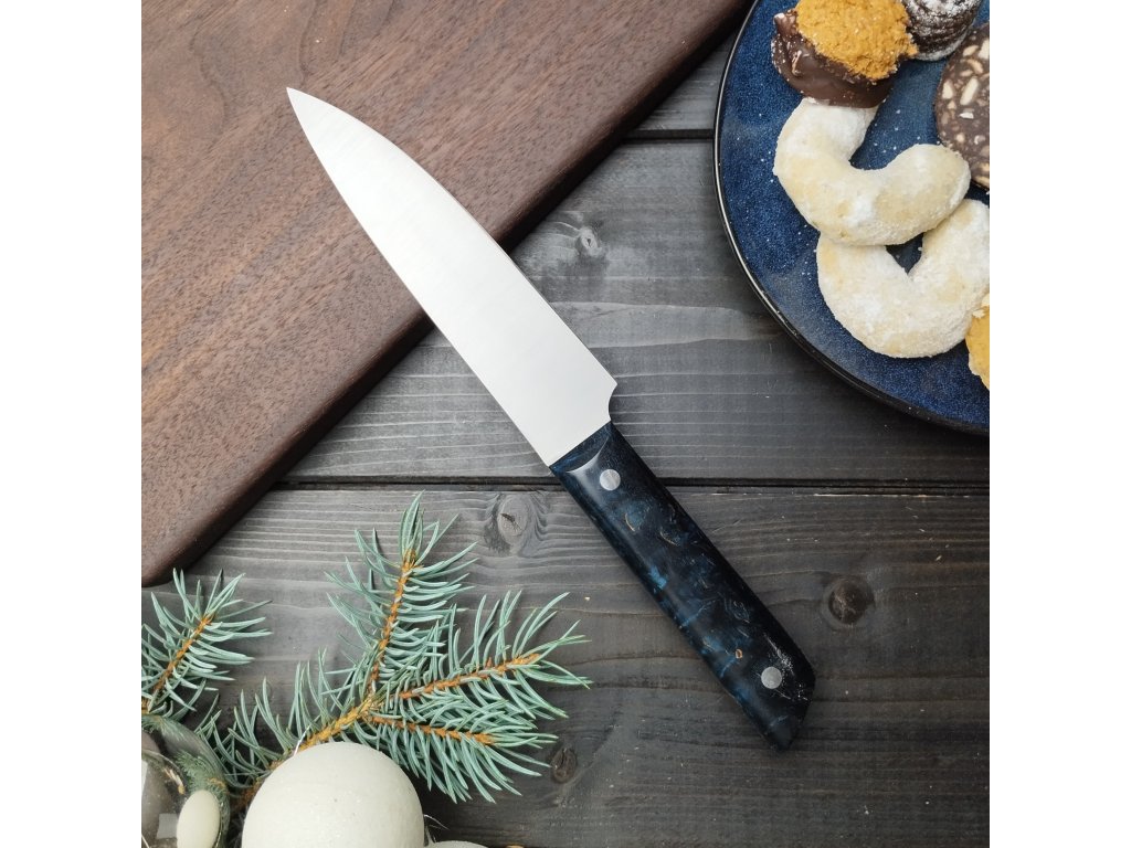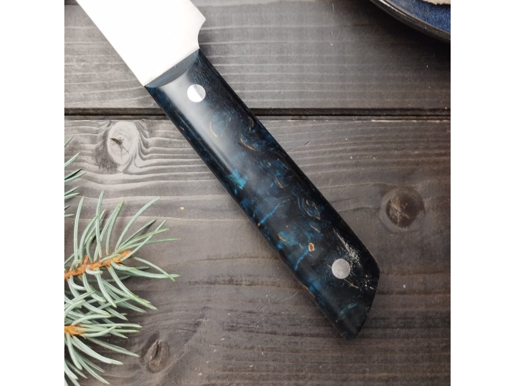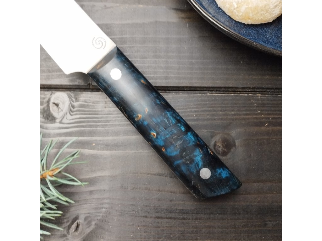 Tento ručně vyráběný nůž s čepelí dlouhou 14 cm je ideální pro každodenní práci v kuchyni – snadno nakrájíte zeleninu, maso i bylinky. Oproti velkým kuchařským nožům má kratší čepel a lehce zmenšenou rukojeť, což usnadňuje manipulaci a zvyšuje přesnost krájení.